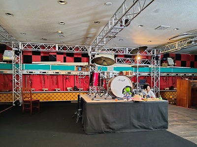 舞台。機材がそのまま残る、廃パチンコ店内にイントレタワーで囲み、中央の高台に