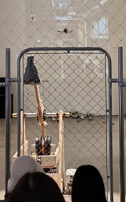 かな。タッパと奥行きのあるギャラリー空間、奥にドローンとその発話字幕、