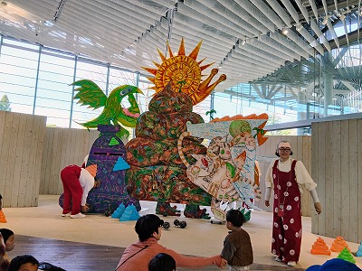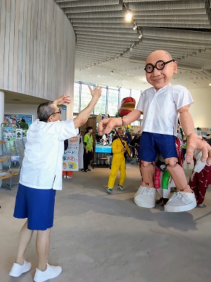会場内で座り展示されていた、巨大しゅういちが動き出す。スネイクを子供達らで