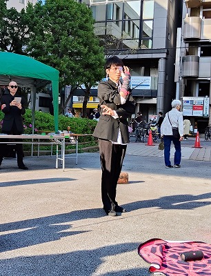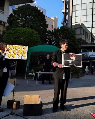 客入れ:感染対策特段なし。野外劇フェス。駅前公園広場にパイプ椅子、演目毎に